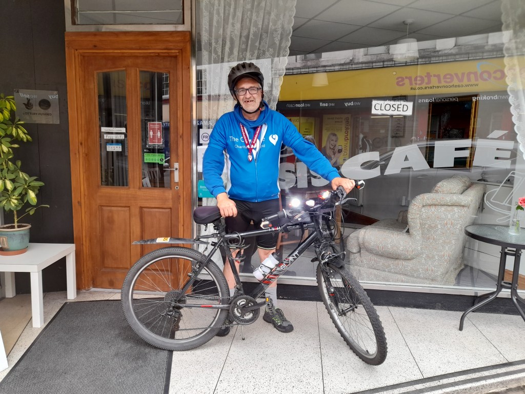 Andrew Pickford a recent customer to the Oasis café. We supported him on his bike ride from Manchester to Blackpool for Christies Hospital. A total of 60 miles, 4 hours 15 minutes. Andrew cycled along with 2,500 people stopping on the way for a short break of a glass of orange and a smoke. To prepare for this ride Andrew trained for 12 months and swam as many lengths as possible in the local swimming pool for one hour, walked ten miles each week and cycled 25 miles a day. Andrew has raised £750 on this ride, Well done! Andrew!